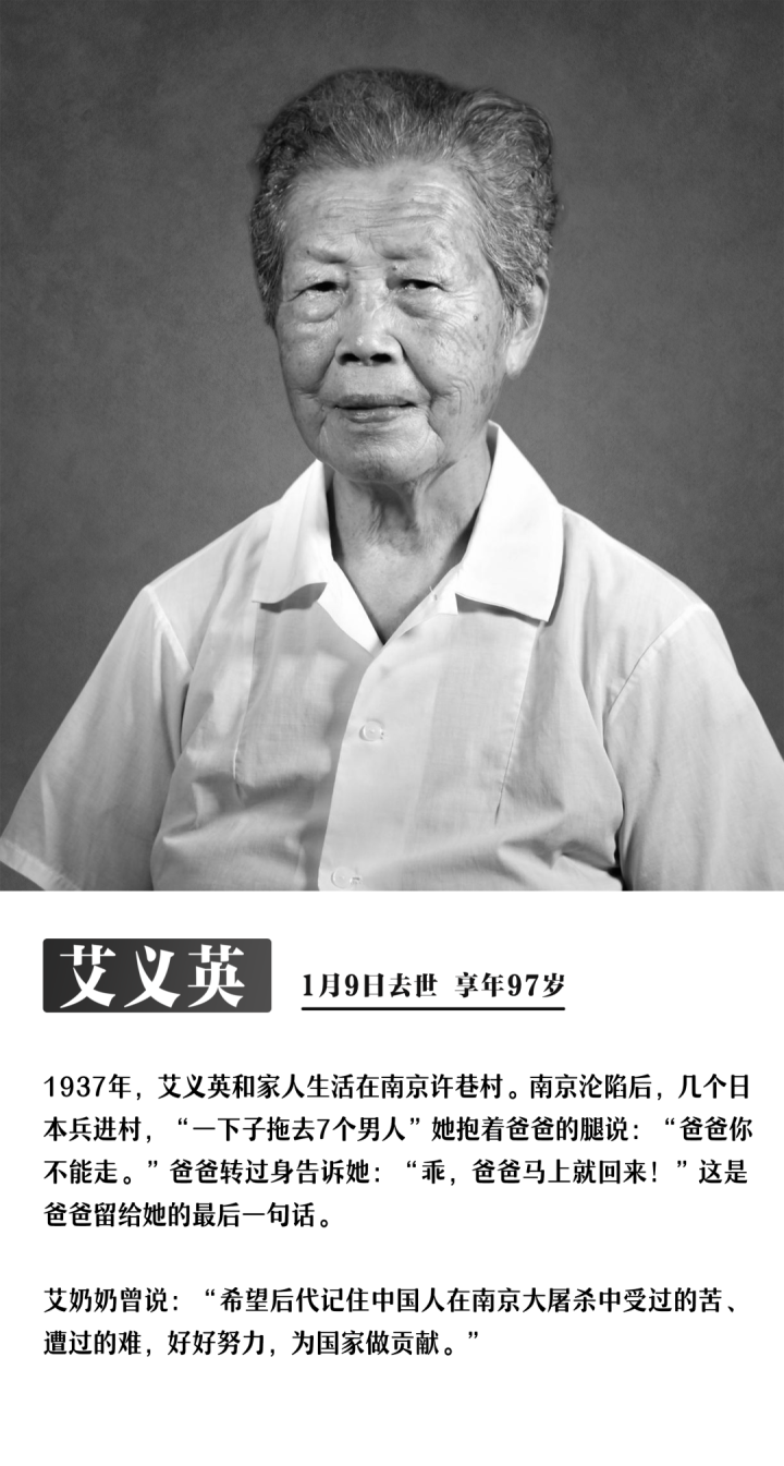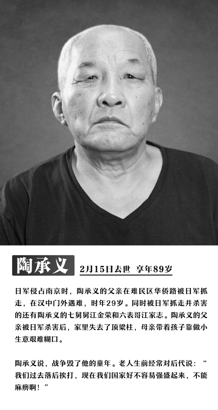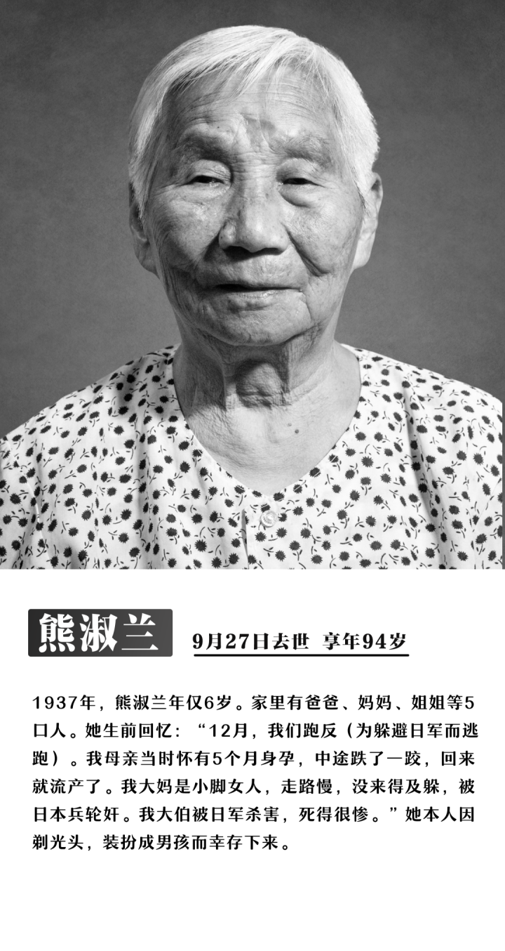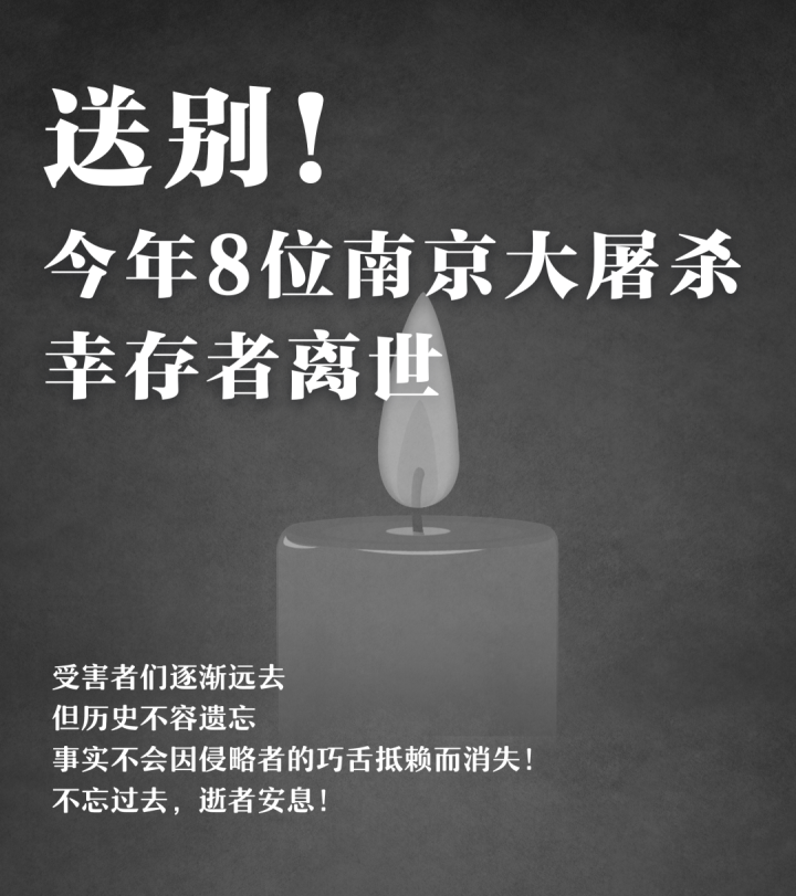 截至12月4日,今年已有8位南京大屠杀幸存者离世,他们没有等到今年的国家公祭日。他们是:艾义英、伍秀英、易兰英、陶承义、谢桂英、刘贵祥、熊淑兰、唐复龙。受害者们逐渐远去,但历史不容遗忘,事实不会因侵略者的巧舌抵赖而消失!不忘过去,逝者安息!